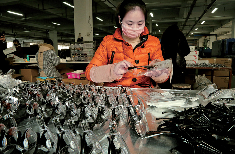 3月5日,济源康安卫材有限公司员工正在组装防护眼镜。